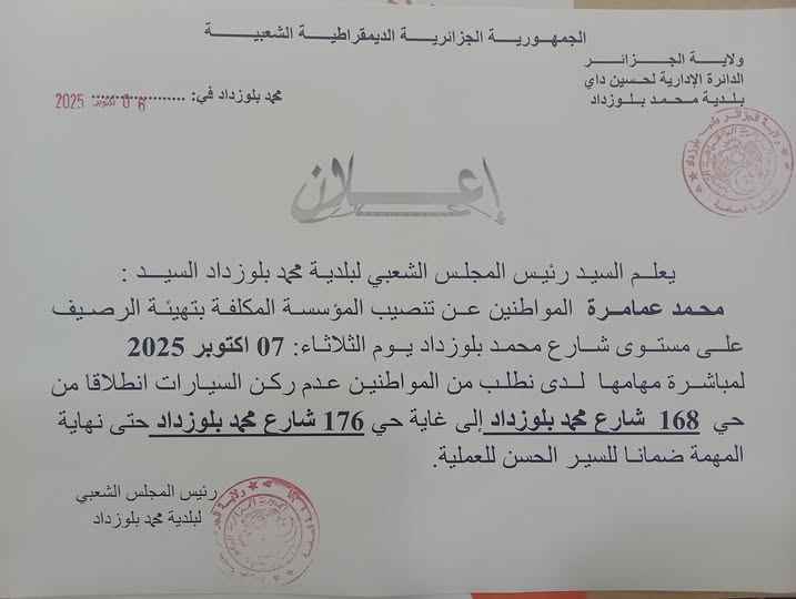 كافة المواطنين عن تنصيب مؤسسة مكلفة بتهيئة الرصيف على مستوى شارع محمد بلوزداد و ذلك يوم الثلاثاء الموافق ل 07/10/2025 لمباشرة مهامها لذا نطلب من المواطنين عدم ركن السيارات في الشوارع المذكورة في الاعلان المنشور اعلاه.